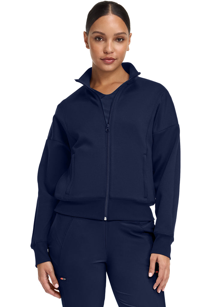 A premium new piece your wardrobe will welcome. Super-soft with stretchy ribbed accents, this sleek, sporty jacket features vivid pops of neon that match its color-tipped zippers. Exceptionally comfy and cozy, its roomy dolman sleeves layer easily over scrubs.